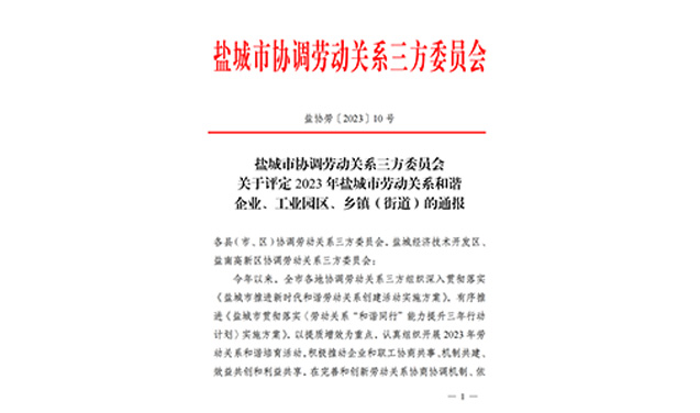 近日,鹽城市協(xié)調(diào)勞動(dòng)關(guān)系三方委員會(huì)按照《關(guān)于開展 2023 年勞動(dòng)關(guān)系和諧培育活動(dòng)的通知》的工作部署,經(jīng)各地協(xié)調(diào)勞動(dòng)關(guān)系三方委員會(huì)培育、驗(yàn)收、推薦,市協(xié)調(diào)勞動(dòng)關(guān)系三方委員會(huì)研究決定,評(píng)定鹽城市灌東經(jīng)濟(jì)開發(fā)投資有限公司為 2023 年鹽城市勞動(dòng)關(guān)系和諧企業(yè)之一。2024-01-08 -